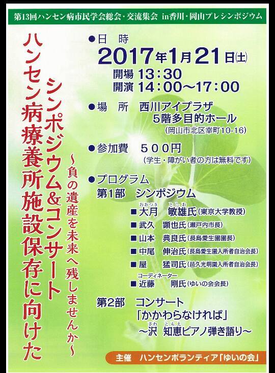 ハンセンボランティア「ゆいの会」は、1月21日(土)、岡山市内で、「ハンセン病療養所施設保存に向けたシンポジウム&コンサート」を開催します。