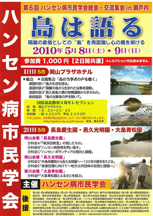 第6回ハンセン病市民学会総会・交流集会in瀬戸内のポスター 第6回ハンセン病市民学会総会・交流集会in瀬戸内のポスターができました。 同総会・交流集会への申し込みは、実行委員会のHP(右上リンク)に入ってください。申し込み窓口の日本旅行岡山支店のHPにリンクしています。2月15日から申し込みの受付を始めました。大勢の参加申し込みをお待ちしています。 [0回]PR コメント コメントを書く コメントを書く コメント送信